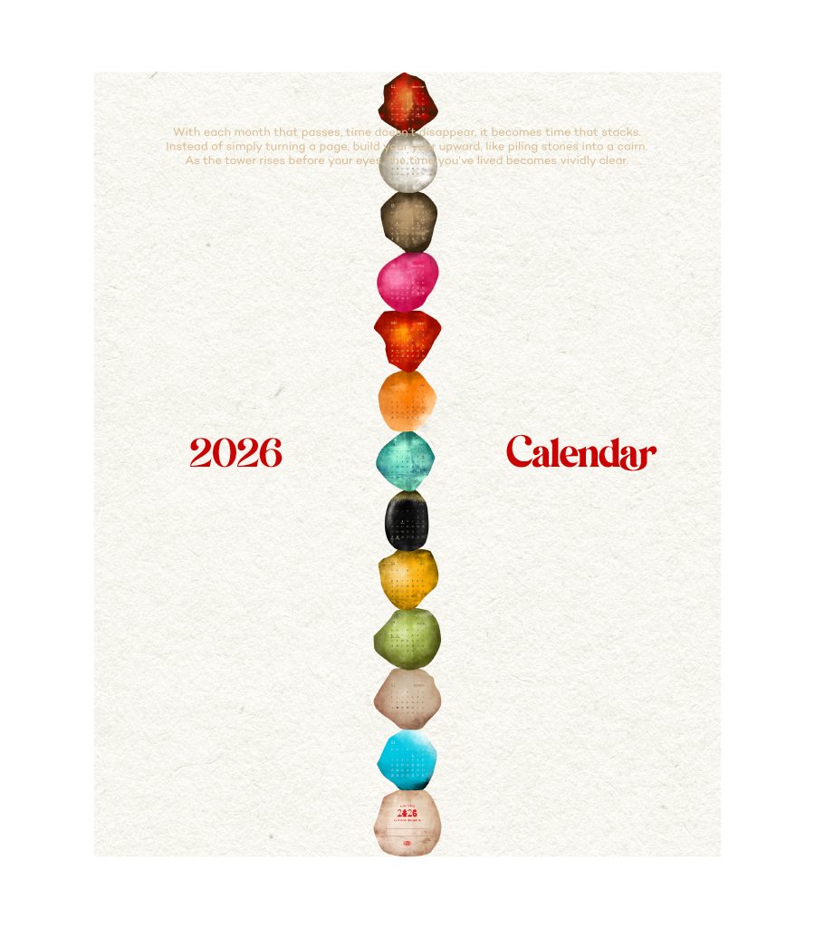 1월이 지나면, 2월로 페이지를 넘기는 대신에, 1월을 그대로 두는 거예요. 그리고 2월을 그 위에 쌓아 올립니다. 3월은 또 그 위에 올리고요. 돌탑 쌓듯이요. 1월, 2월, 3월. 이렇게 달달이 탑처럼 쌓이는 달력. 저는 이 상상을 하다가 혼자 웃었어요. 너무 귀엽잖아요. 달력이 갑자기 돌탑이 되는 거니까. 귀여운데, 또 정확해요. 시간은 원래 그런 식으로 쌓이니까요.